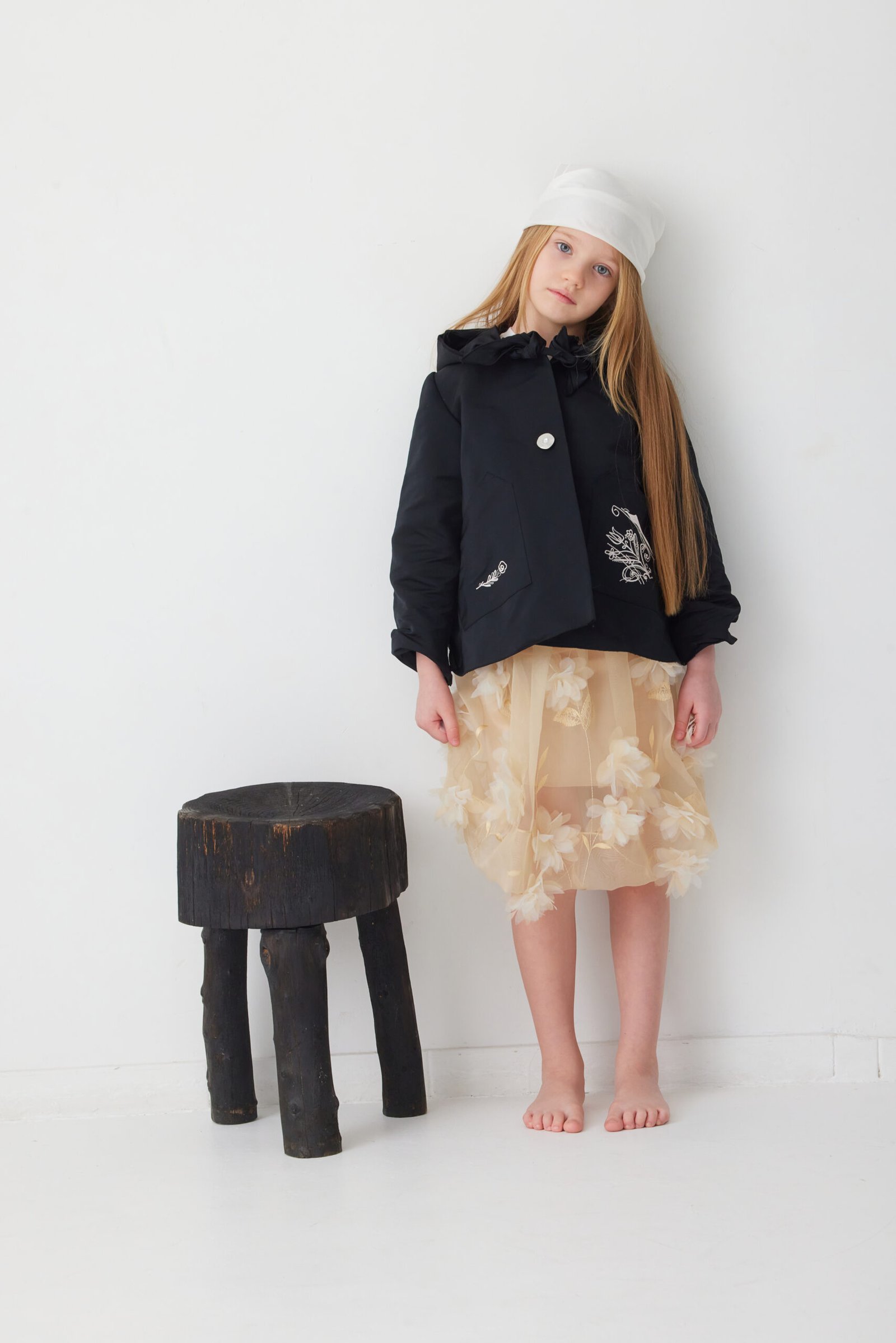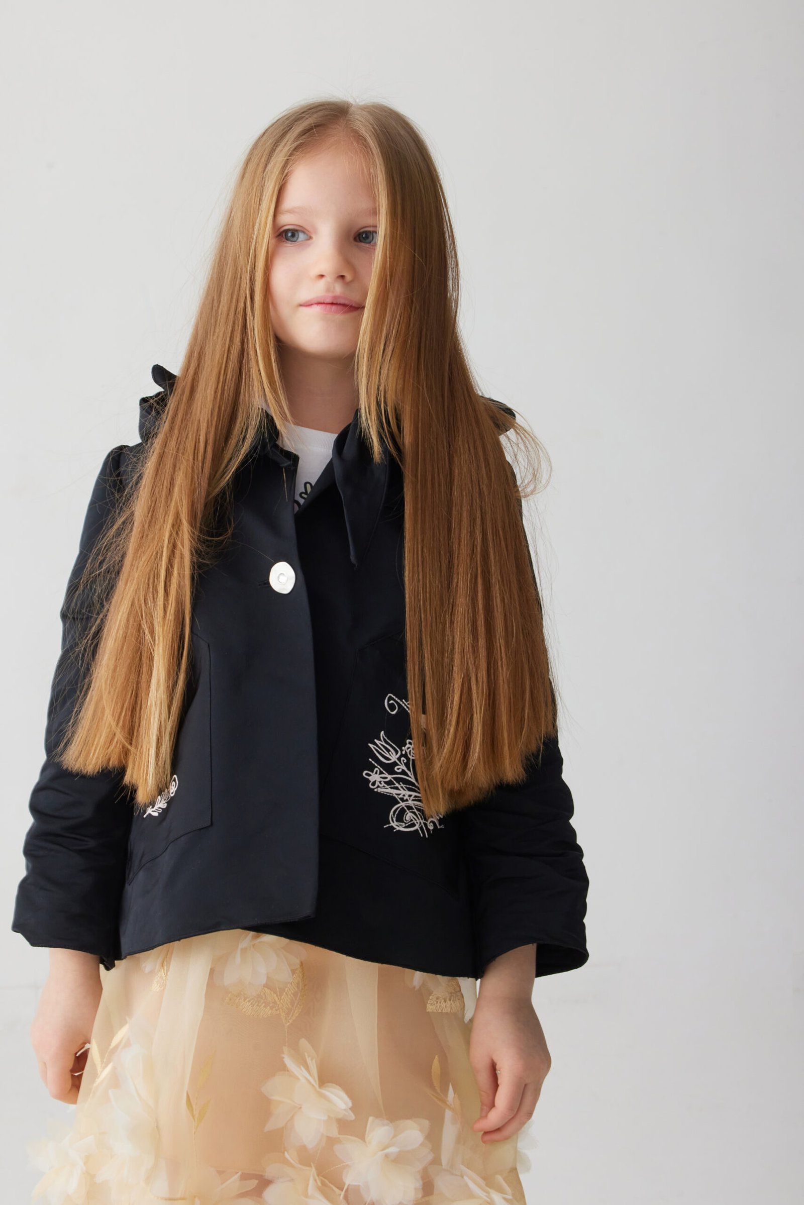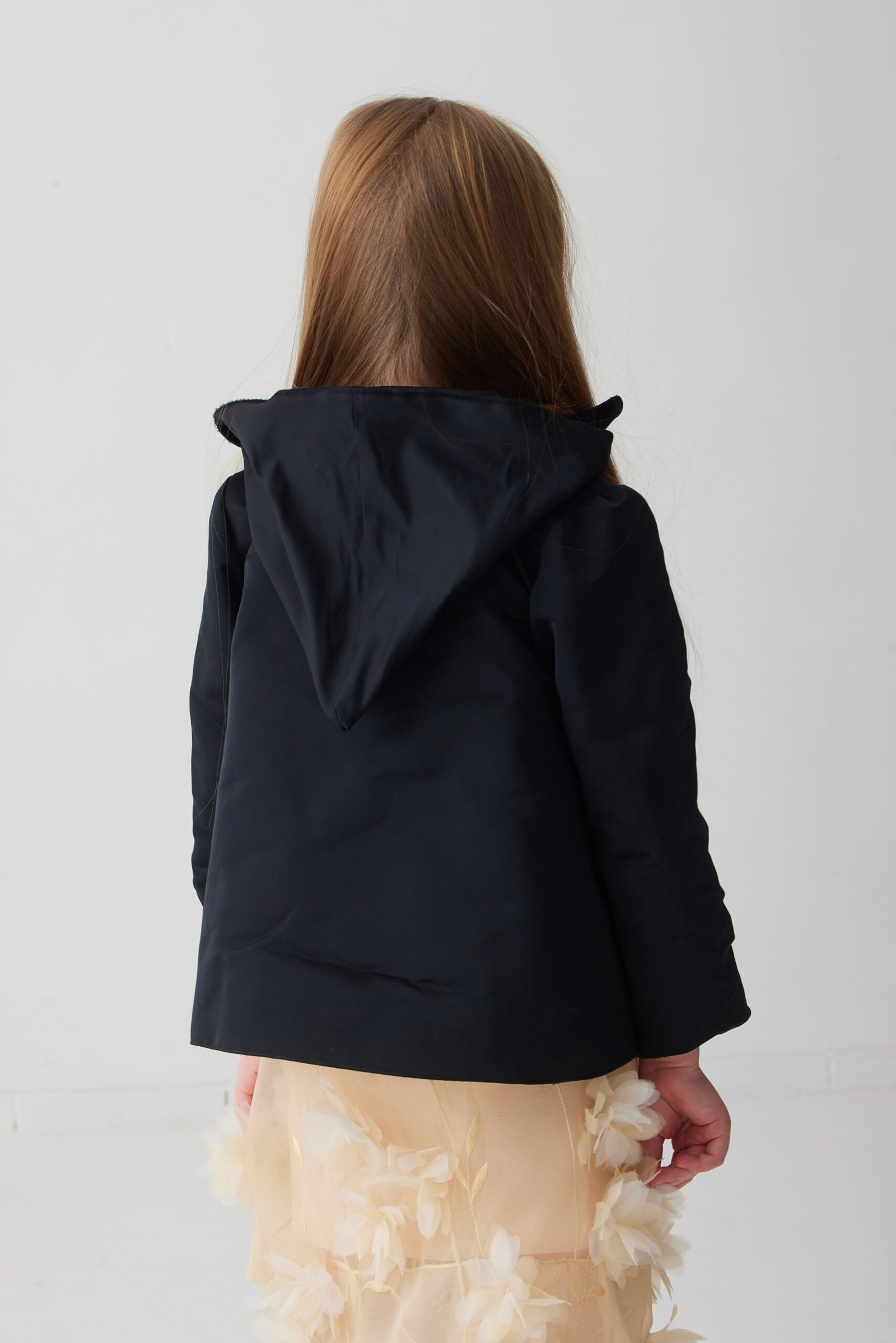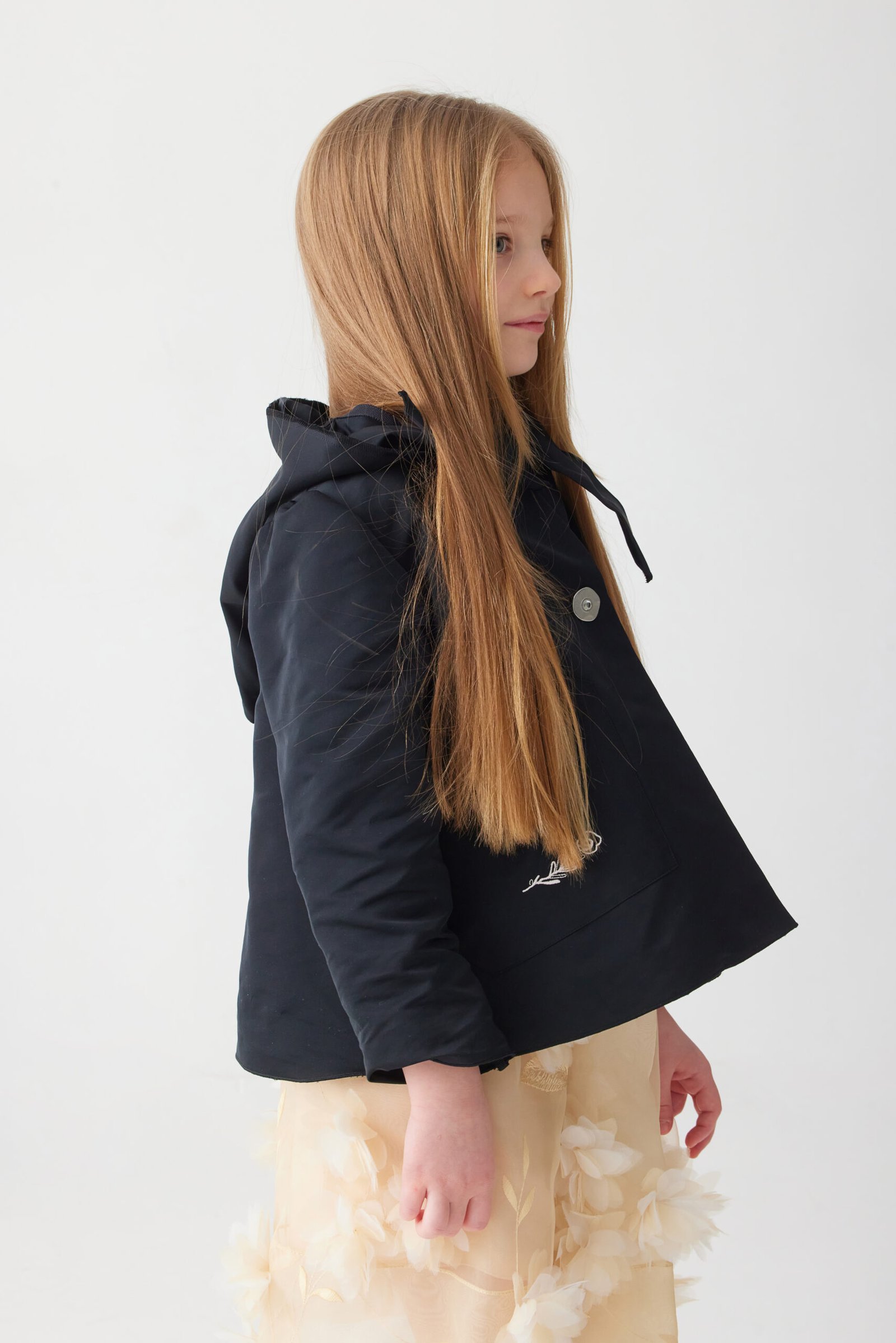 Elevează ținuta micuței tale cu un trenci elegant din tafta moale, cu broderie la buzunar și glugă detașabilă practică.